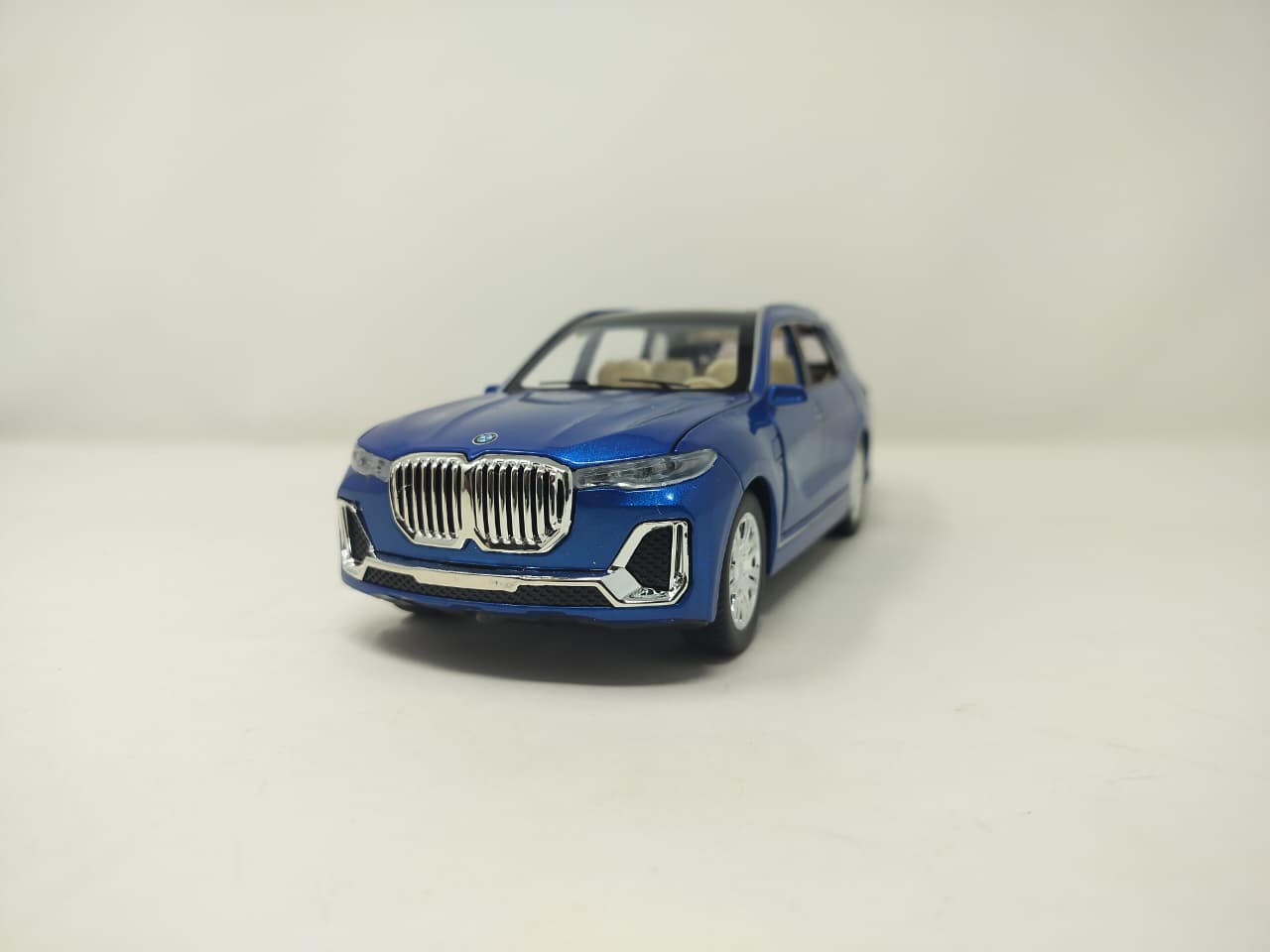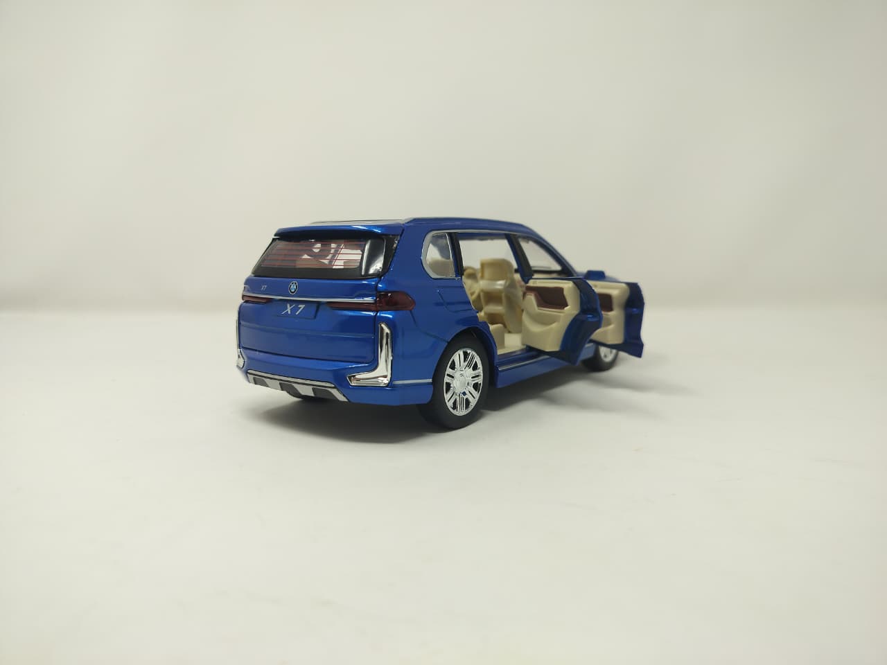 Elevate your collection with this vibrant blue BMW X7 die-cast, featuring a sleek metallic finish and functional doors that reveal a detailed luxury interior.